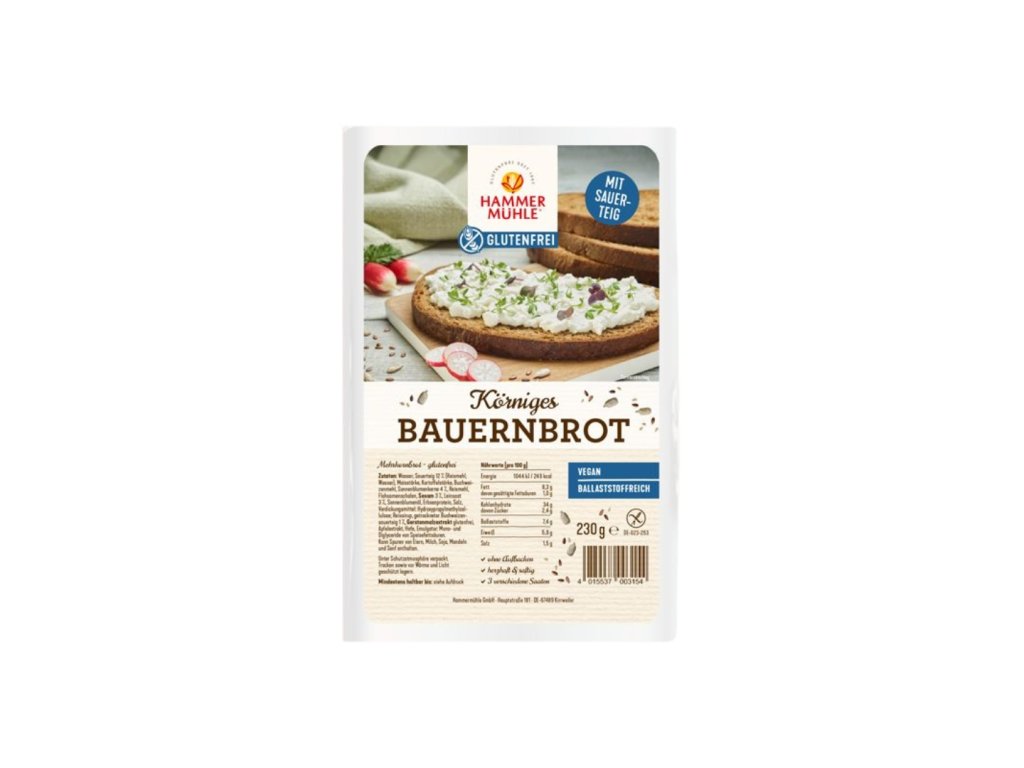 Voda, kvásek 12 % (rýžová mouka, voda), kukuřičný škrob, bramborový škrob, pohanková mouka, slunečnicová semena 4 %, rýžová mouka, slupky psyllia, sezam 3 %, lněné semínko 3 %, slunečnicový olej, hrachová bílkovina, sůl, zahušťovadlo: Hydroxypropylmethylcelulóza; rýžový sirup, sušený pohankový kvásek 1 %, bezlepkový extrakt z ječného sladu, jablečný extrakt, droždí, emulgátor: mono- a diglyceridy mastných kyselin.